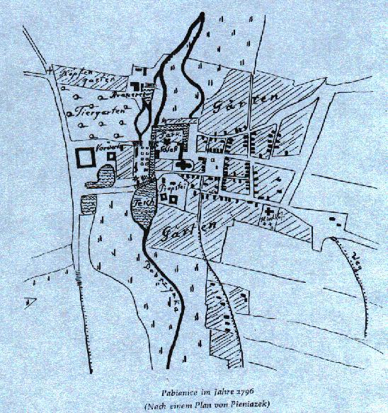 Die Stadt Pabianice vom Jahre 1796 bestand aus einigen wenigen Häuserblocks um den Marktplatz herum. Die Preußen haben 1794 nur 75 Häuser gezählt, davon waren 48 mit Stroh bedeckt, der Rest mit Schindeln. Natürlich waren selbst Schornsteine damals noch eine auffallende Neuerung. Irgendwo im Giebel befand sich eine Öffnung, aus der der Rauch einen Werg ins Freie fand, soweit er nicht durch den Hauseingang entweichen konnte. Scheunen gab es 64. Die ehrbaren Bürger einer löblichen bischöflichen Stadt Pabianice gingen ihrem Unterhalt hinter ihrem Ochsen nach, mit denen sie ihre Äcker pflügten. Am Sonntag war alles in der Kirche, denn laut Verfügung hatte „jeder Bürger und Bewohner von Pabianice zufolge seiner Christenpflicht jeden Sonn- und Feiertag in der Kirche zur Messe und Predigt zu sein unter der Androhung der Strafe eines polnischen Groschen". Der Besuch der Schenke war weder empfohlen noch verboten. Schließlich konnte doch eine geistliche Herrschaft nicht für die Schenke werben, wiewohl sie anderseits mit einer eigenen Brauerei und Brennerei für den notwendigen Stoff sorgte. Auf der Kartenskizze vom Jahr 1796 sind die Hopfengärten und die Brauerei verzeichnet. Auf dem Gut (Vorwerk) schufteten die Tagelöhner unter der Aufsicht der „Wlodarze" (Antreiber oder Aufseher) die den Stock treffsicher zu schwingen wußten. Dort standen die Scheunen und Speicher und die Wohngebäude der Gutsverwaltung. Anstatt Pabianice wird auch viel der Name "Fabianice" verwendet, oder wie es die ehemaligen Lodzer Schwaben abkürzten "Fabianitz"